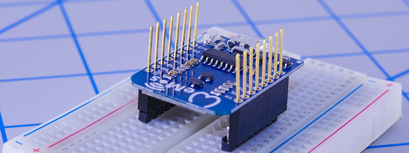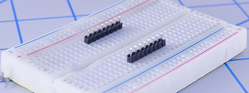 So that we can mount the WeMos D1 Mini on a breadboard we'll choose the long female pin header. To facilitate the soldering process we first secure the pin headers. One way to do this is to use a breadboard to hold the pin headers in place.