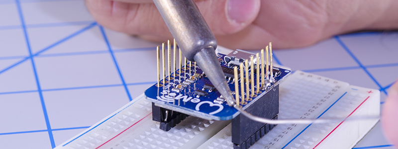 After securing the pins, we solder each one to the board to make a robust connection. Finally, we let the board cool down for a couple of minutes, and then remove it from the breadboard or tape.