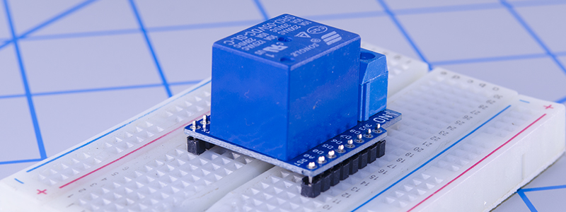 The circuitry of the Relay Shield is set up so that the coil (control side) of the relay is connected between 5V and the collector terminal of a transistor. The base of the transistor is connected to a digital pin of the WeMos D1 Mini board (pin D1 when stacked) so that the state of the transistor–and thus, the state of the coil–can be turned ON and OFF based on whether the pin is at a HIGH (3.3VDC) or LOW (0VDC, ground) voltage. We can specify the HIGH/LOW state of pin D1 in the code running on the ESP8266.