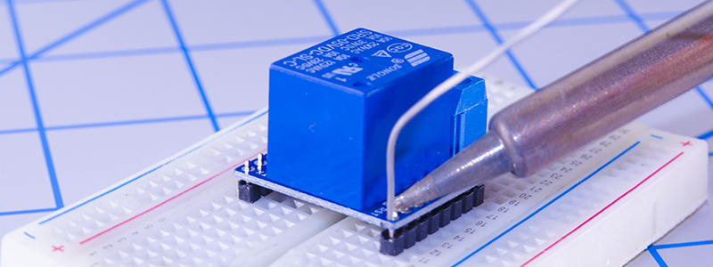 Now, we can proceed in a similar fashion to solder the pins onto the Relay Shield. For this board, we select the male pin headers that were included with the shield.