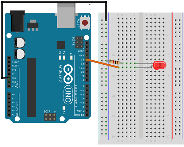 The ‘L’ LED turns on and off simultaneously with the LED we've connected to pin 13! This is not an error, but a consequence of the ‘L’ LED being connected internally on the Arudino board to pin 13.