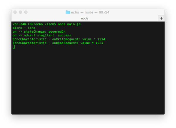 We can verify that the request is received by looking at the debug messages of our Bleno app. In our case, the app prints out EchoCharacteristic - onReadRequest: value = 1234 after receiving it!