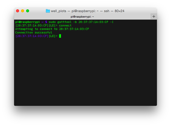 In the previous step we were able to get the MAC address 28:37:37:1A:D3:CF of the Peripheral Device that we're running through the Bleno app. To connect to this device we're going to use another tool part of the BLE stack we installed called gatttool. We're able to run this tool in an interactive mode so that we step through the process of issuing commands over BLE to our Peripheral Devices!