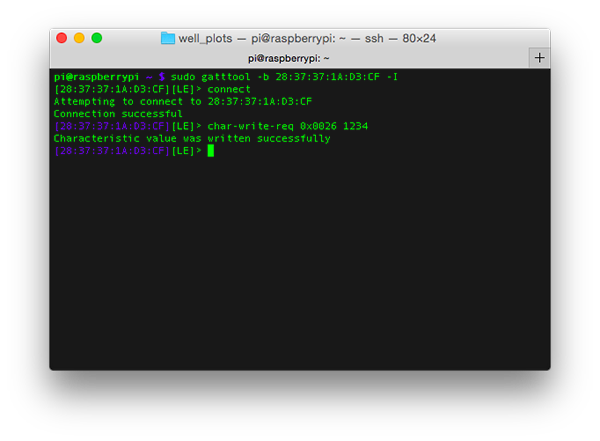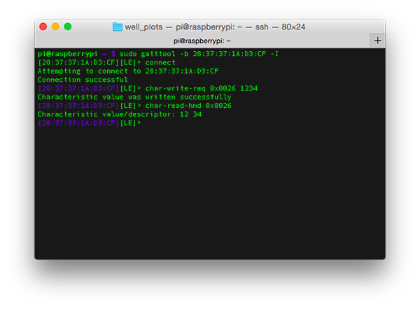 One of our favorite features of Bluetooth 4.x is that, different than in previous versions, we need not go through the obnoxious pairing process to connect to a device. On our Raspberry Pi, we'll be using the program gatttool to connect to our nearby BLE device, and write/read data to/from it.