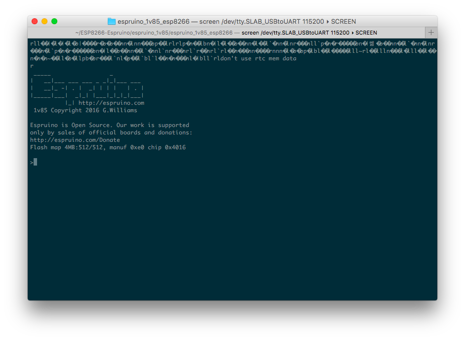 Now we can use any Serial Terminal programs to start sending JavaScript commands over USB to the ESP8266, and have the Espruino firmware interpret them accordingly. In our case, we'll use the program screen available in OSX, so from our terminal we enter: