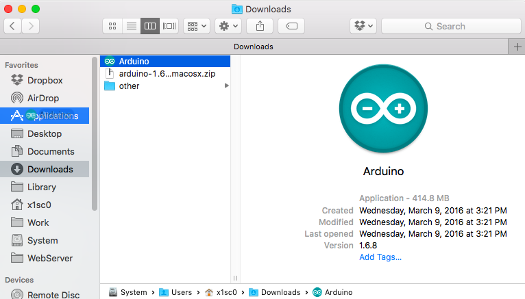 Double click the zipped file arduino-1.6.8-macosx.zip to extract the Arduino app. You can execute it from it's current location, but it is common practice to move it to your Applications folder. The quickest way is to drag and drop it using Finder.
