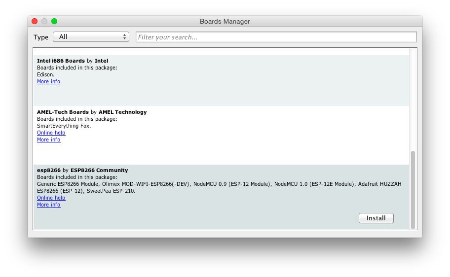 Select the menu option Tools → Board → Boards Manager... and scroll down and to locate the option esp8266 by ESP8266 Community which should be the last item on the list, and click Install.