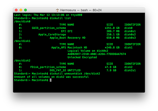 Next, we unmount the card, which dettaches its filesystem from the currently accessible filesystem of our computer. Amongst other things, this stops any pending read/write operations to the card: