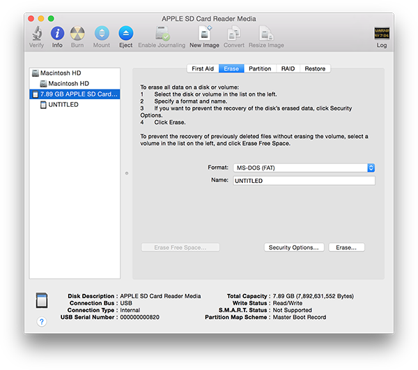 Erase tab next to the First Aid one.MS-DOS (FAT) from the Format drop down options (if not selected by default).Erase button near the bottom right corner of the window.Now that we have downloaded the Raspbian image file and successfully formatted our microSD card, we are ready to write the image file onto it.