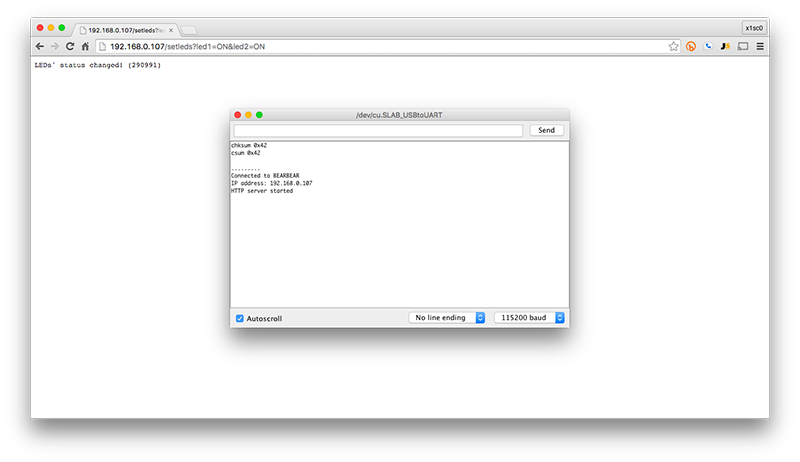 Note that both parameters need not be specified simultaneously on a request. Once the LEDs are set the server sends an OK (200) response notifying whether the LEDs' status was changed. For this, we simply check to see if at least one of the four expected parameters were included in the request.