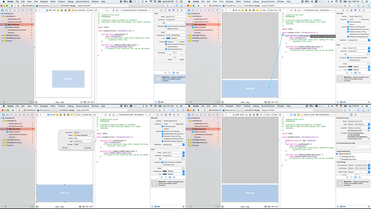 We can then proceed to add the first of four Button objects repeating the process we followed to add the Web View. However, instead of adding an Outlet, we'll add an IBAction that we'll name led1on. We'll modify the code of this IBAction in the ViewController.swift file with the function calls that will allow us to access the API of our web application running on the ESP8266.
