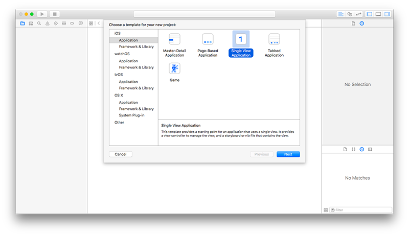 To write our iOS App, we're going to start a new project in Xcode 7 File → New → Project... that is going to be a Single-View Application for iOS: