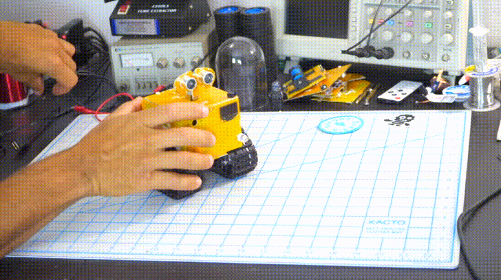 WHEEL-E is a pretty comprehensive platform that includes a wide array of sensors for detecting his surroundings, DC motors and tank threads for movement, an Arduino microcontroller (Microchip's ATmega328p) and a Wi-Fi chip (Espressif's ESP8266) for wireless communication, and a few other devices such as multi-color LEDs, sound buzzer, OLED display, and a VGA camera for all sorts of projects!