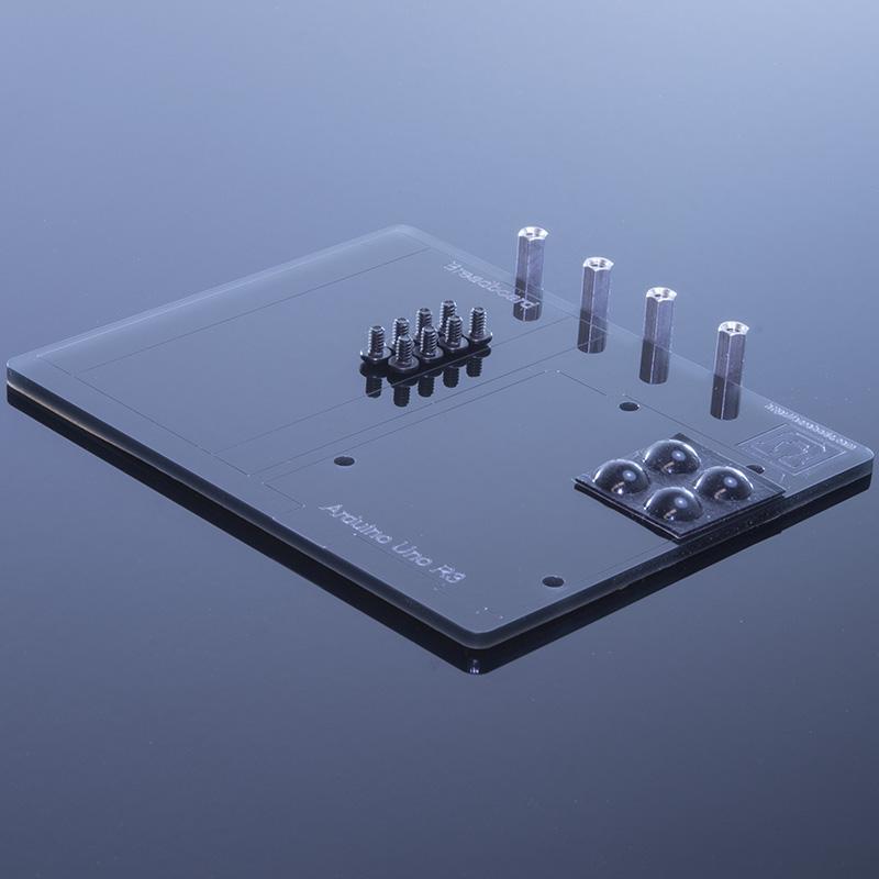 This acrylic plate is great for protecting your electronics, and big enough to fit a Half-Sized Solderless Breadboard right next to your Arduino Uno Board. The plate measures 3mm (~1/8in) thick, 114mm (~4.5in) long and 93mm (~3.66in) wide, and comes with all the necessary hardware to easily and securely mount your Arduino Uno. It also includes a set of 4 rubber 'bumpers' which prevent the plate from sliding around on your work desktop or work surface.