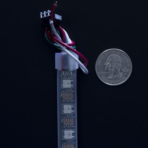 The flexible PCB and WS2812 RGB LEDs are packaged inside a 12.5mm-wide, translucent, silicone sleeve that has an IP65 waterproof rating. Given that we want to offer you the option of cutting the strips to any desired length, we also sell additional end caps separately (2 of them are already included with each strip we send you), which allow the strips to be sealed up again after cutting.