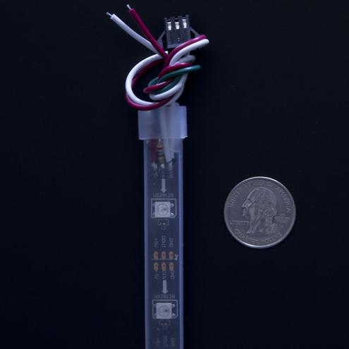 The flexible PCB and WS2812 RGB LEDs are packaged inside a 12.5mm-wide, translucent, silicone sleeve that has an IP65 waterproof rating. Given that we want to offer you the option of cutting the strips to any desired length, we also sell additional end caps separately (2 of them are already included with each strip we send you), which allow the strips to be sealed up again after cutting.