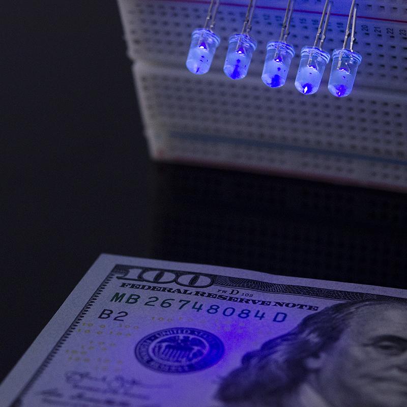 They are easy to use with solderless breadboards, and typical applications include counterfeit detection (bills, credit cards, documents, etc), sterilization, pesticide, black lights, sun burn detection, and more! They come in a pack of five (5) to add more UV blinky-ness to your projects.